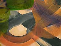 Je pakt een grote kwast en banen trekken maar. Klinkt gemakkelijk, maar dat is het niet. Want die oranje nevel en die violette tinten boven de grijze banen geven zonsop- of ondergang weer die niet overheerst. Een spel van transparanties geeft ruimtelijkheid. Het groen linksboven, een hint van een landschap waaraan je voorbijschiet.